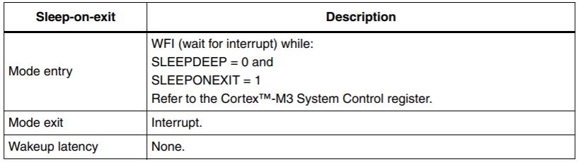 通過(guò)執(zhí)行WFI(等待中斷)或WFE(等待事件)指令進(jìn)入睡眠模式。根據(jù)Cortex-M3系統(tǒng)控制寄存器中的SLEEPONEXIT位,有兩個(gè)選項(xiàng)可用于選擇睡眠模式進(jìn)入機(jī)制: